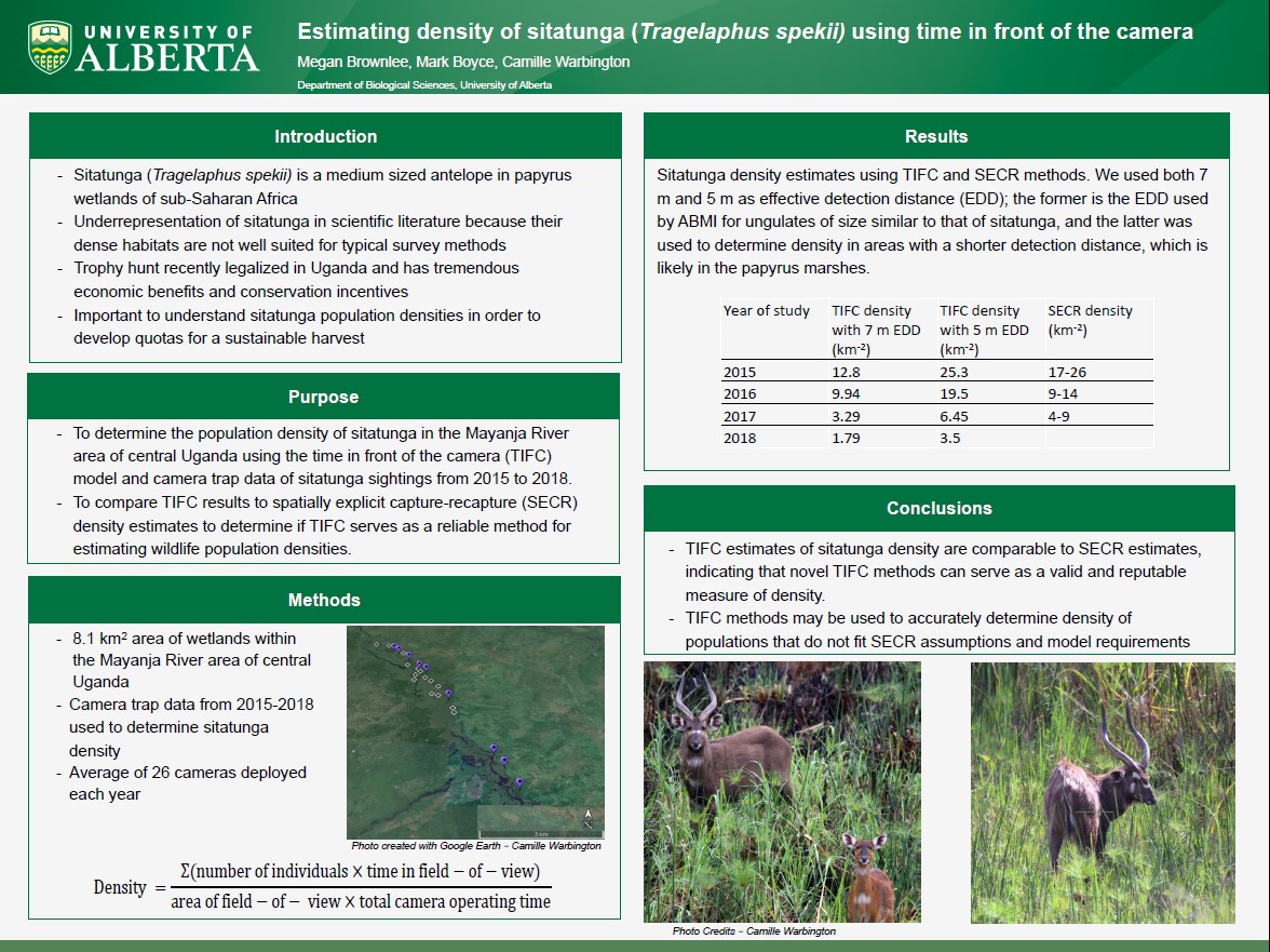 In lieu of the poster session at our 2020 conference, we are profiling posters from this year’s conference on our website every few weeks. This week we’re focusing on using camera traps to estimate density of an African ungulate, the Sitatunga. Poster authors: Megan Brownlee, Mark Boyce, Camille Warbington Poster